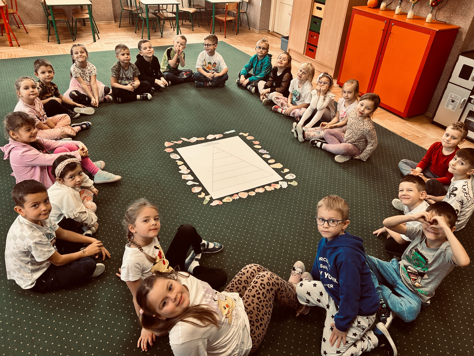 Na podsumowanie całego projektu wspólnie wykonaliśmy Piramidę Zdrowia, utrwalając najważniejsze zasady zdrowego odżywiania.