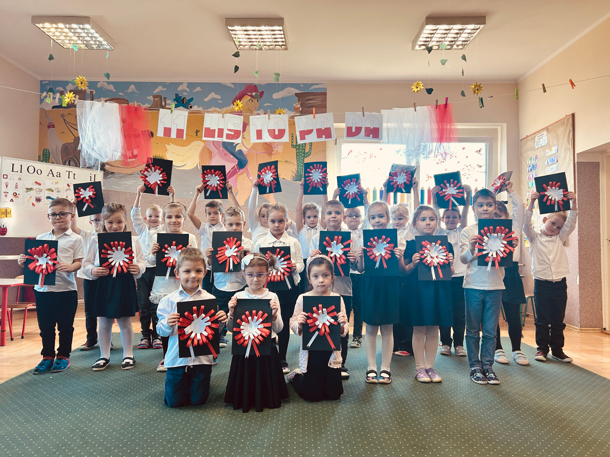 W dniach poprzedzających obchody Święta Niepodległości w grupie Kubusia Puchatka i w grupie Krasnoludków odbyły się zajęcia o tematyce patriotycznej. Maluchy poznały , a Starszaki przypomniały sobie symbole narodowe, wyrecytowały "Katechizm polskiego dziecka", zwróciły uwagę na obecne granice naszego państwa na mapie oraz odśpiewały hymn Polski. Uwieńczeniem zajęć było wykonanie miniaturowych, biało- czerwonych flag, a następnie przemarsz z flagami w ręku do Pomnika Powstańców Wielkopolskich, gdzie w skupieniu przedszkolaki zapaliły znicze i oddały hołd poległym.